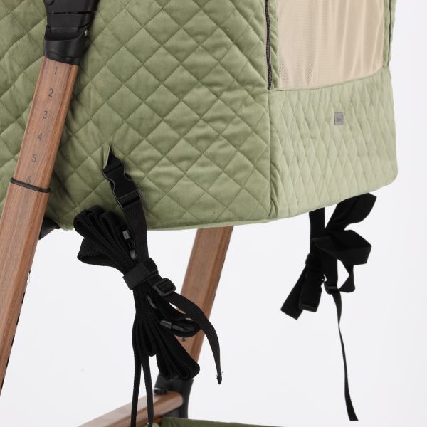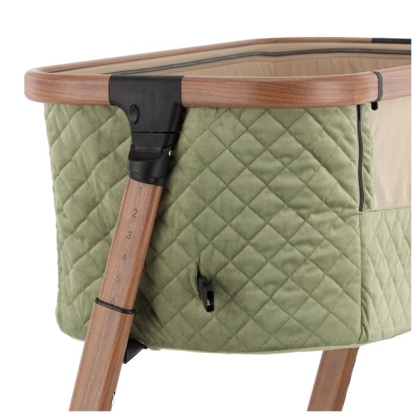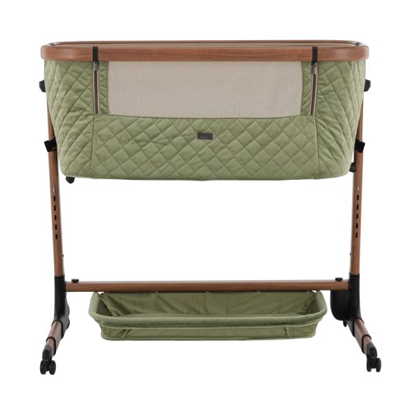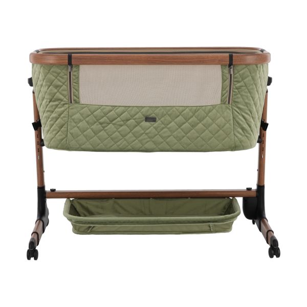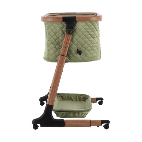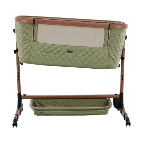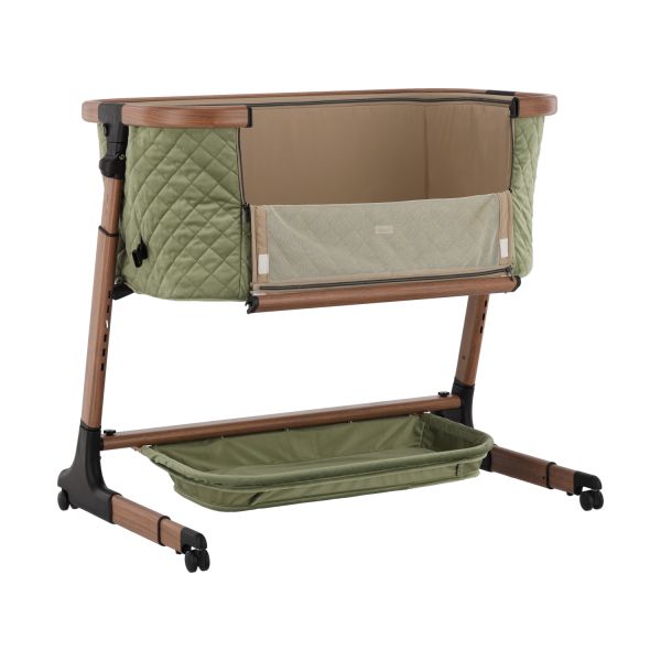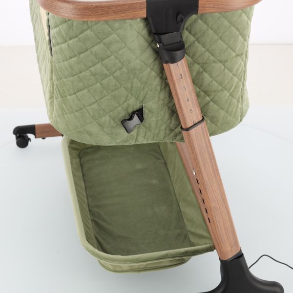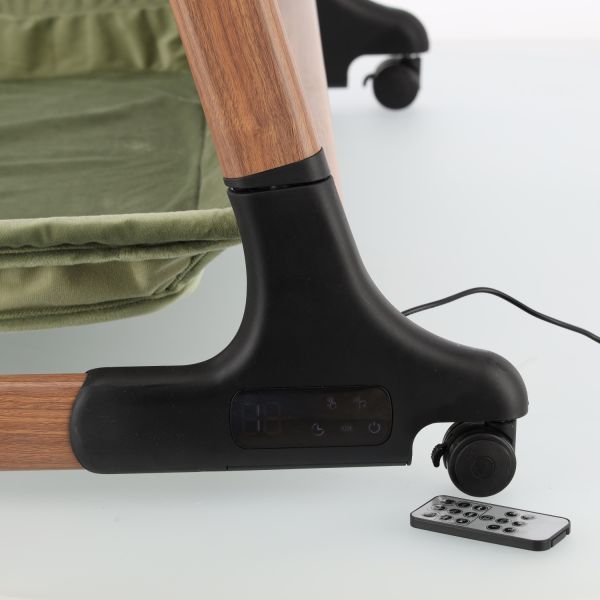 Deze co‑sleeper brengt comfort en technologie samen op een elegant manier. Dankzij de automatische schommelfunctie, die geactiveerd wordt bij beweging van je baby, en de integratie van Bluetooth en rustgevende slaapmelodieën, ervaart je kleintje een rustgevende slaapervaring. De velours bekleding in combinatie met een houtlook afwerking zorgt voor een warme uitstraling die past in elk interieur.