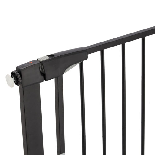 De praktische éénhandbediening maakt openen probleemloos, terwijl de dubbele vergrendeling – een grijs handvat gecombineerd met een schuifknop bovenop – veilig is voor nieuwsgierige kleintjes. Sluit het hekje en zonder hulp valt het automatisch in het slot. Laat je het deurtje helemaal open, dan blijft deze openstaan – handig bij drukte in huis.